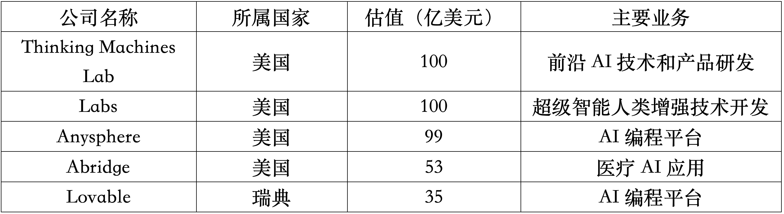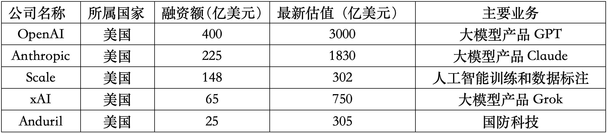 超级独角兽的崛起是本轮AI投资集中化最直观的体现。在近一年来相继完成巨额融资之后,全球估值前十的独角兽之中,已经有四家AI企业(大模型开发商OpenAI、Anthropic和xAI,数据智能和AI平台服务商Databricks)。这些企业的核心价值在于它们对算力、算法和模型的掌握,它们代表了当前市场对于AGI(通用人工智能)潜力的最高定价(表2)。