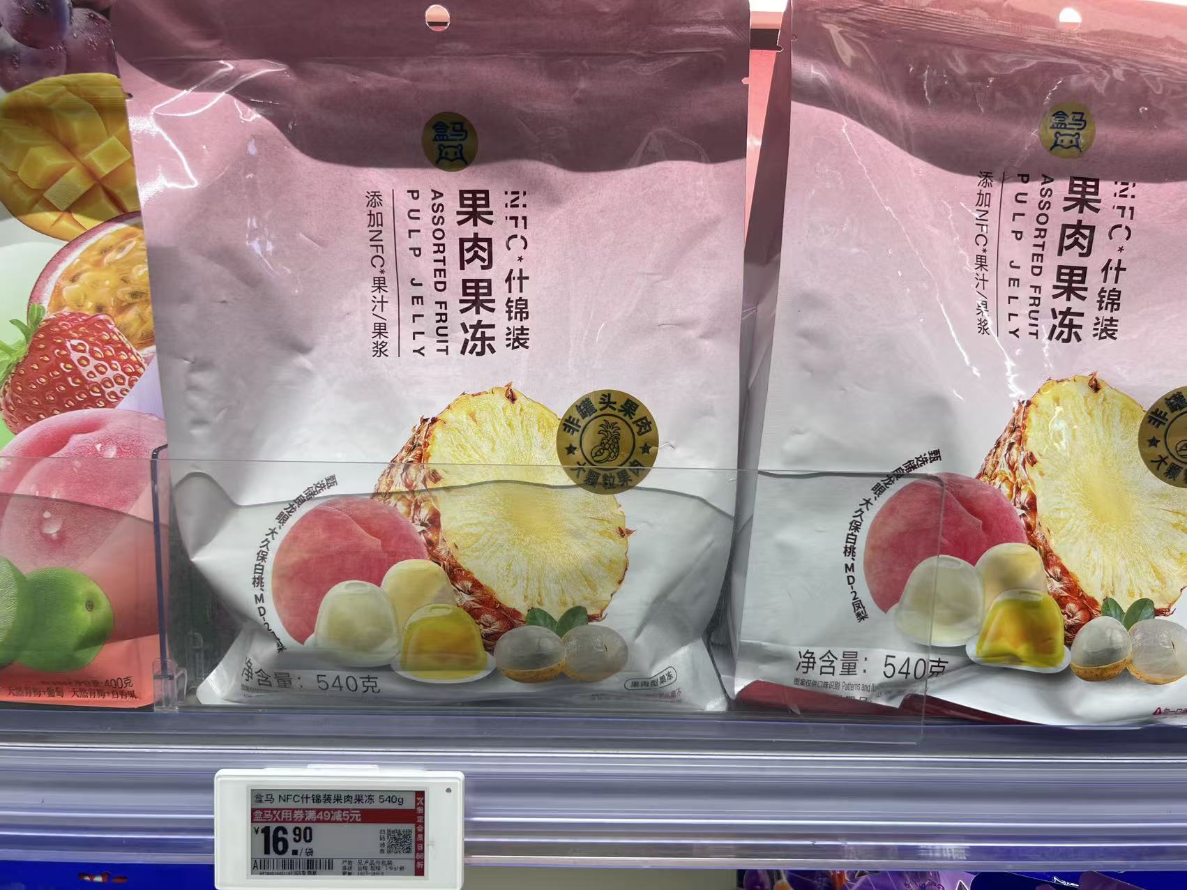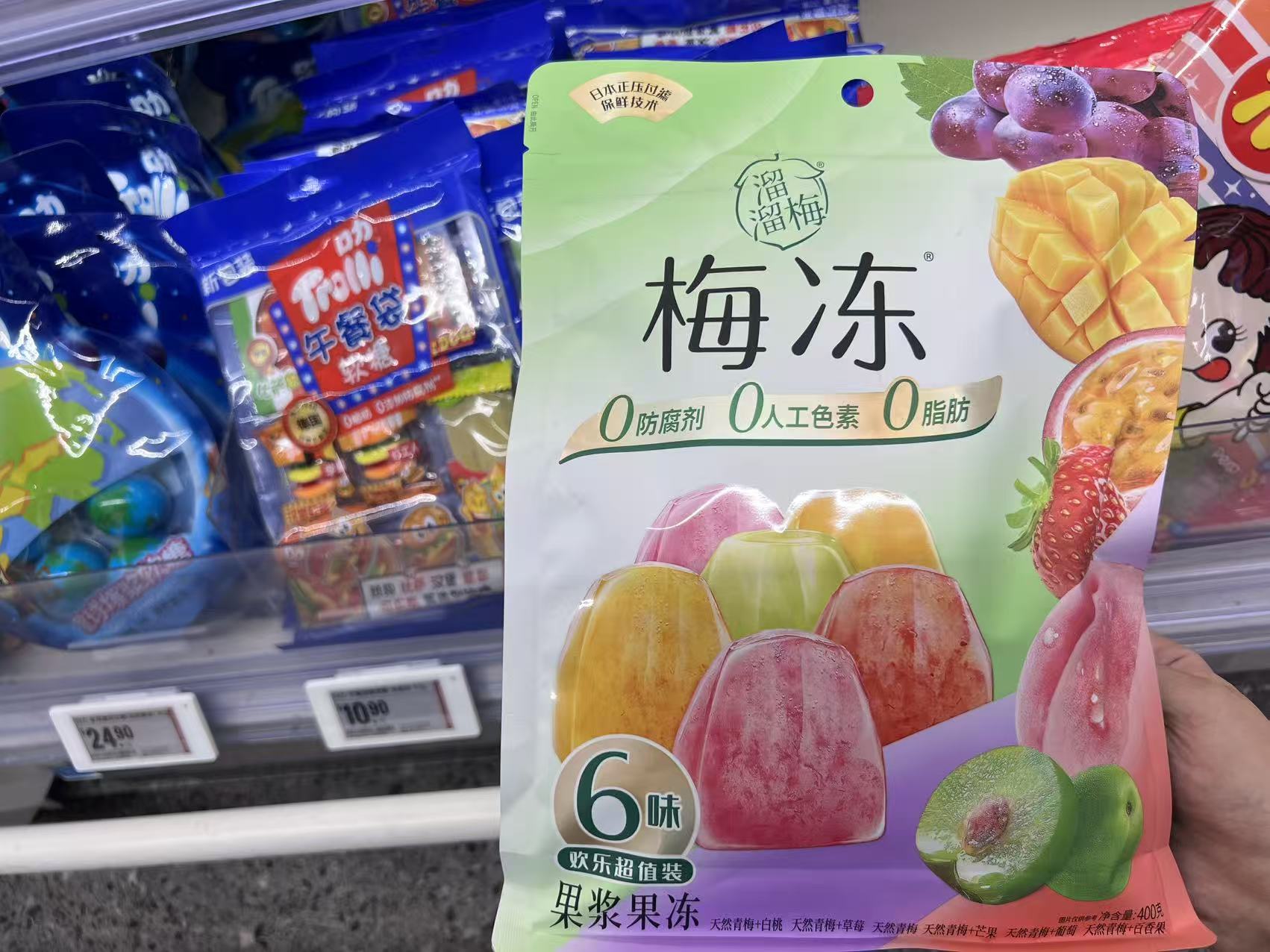 界面新闻于10月29日走访北京世贸天阶盒马门店看到,溜溜梅仅有一款“梅冻”产品在货架出售,而在一旁占据更多SKU的是盒马的自有品牌果冻,包含青提芭乐、荔枝白桃等不同口味。以折后价格计算,盒马自有品牌的什锦果肉果冻540g单价16.9元,溜溜梅梅冻400g为15.8元,二者并没有显著差异。