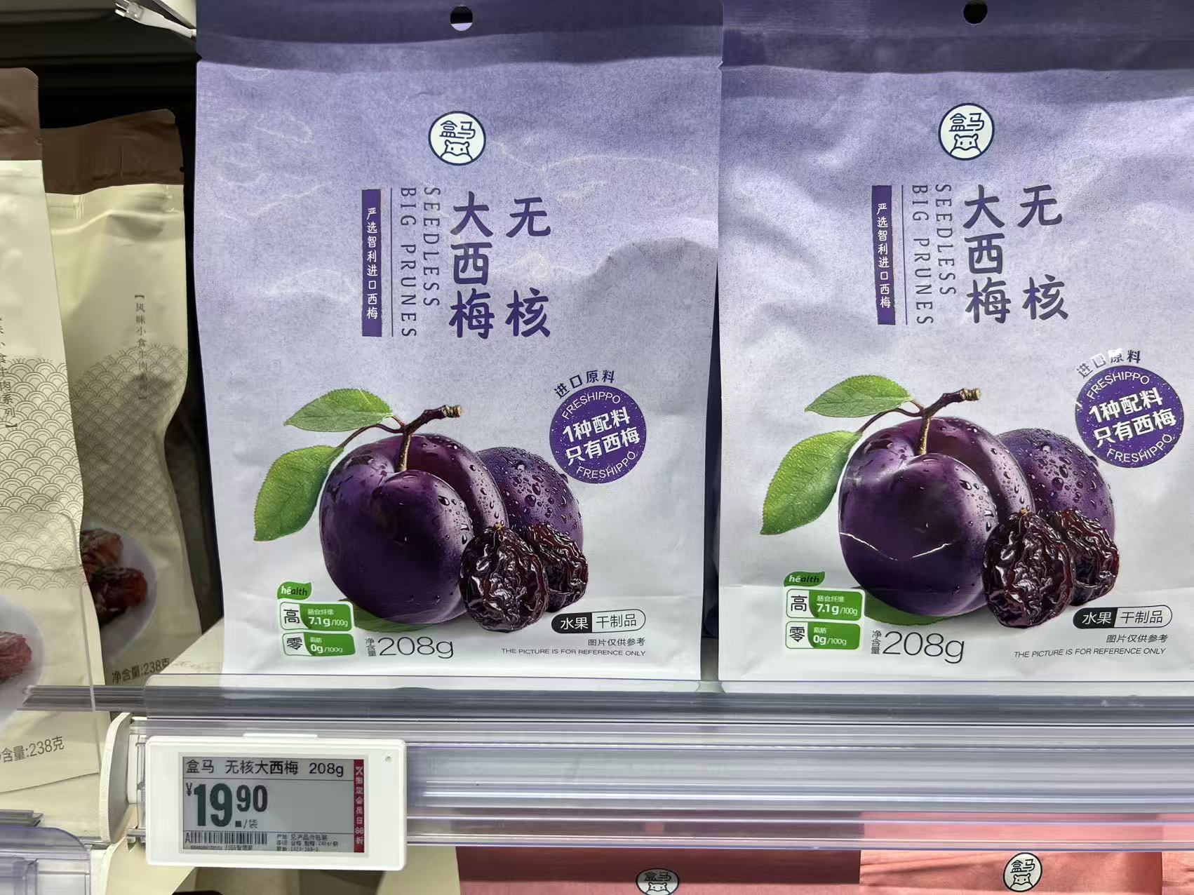 同时溜溜梅的传统产品梅干以及西梅产品并未在货架出现,而显眼处陈列的是盒马果干类的大量自有品牌产品。
